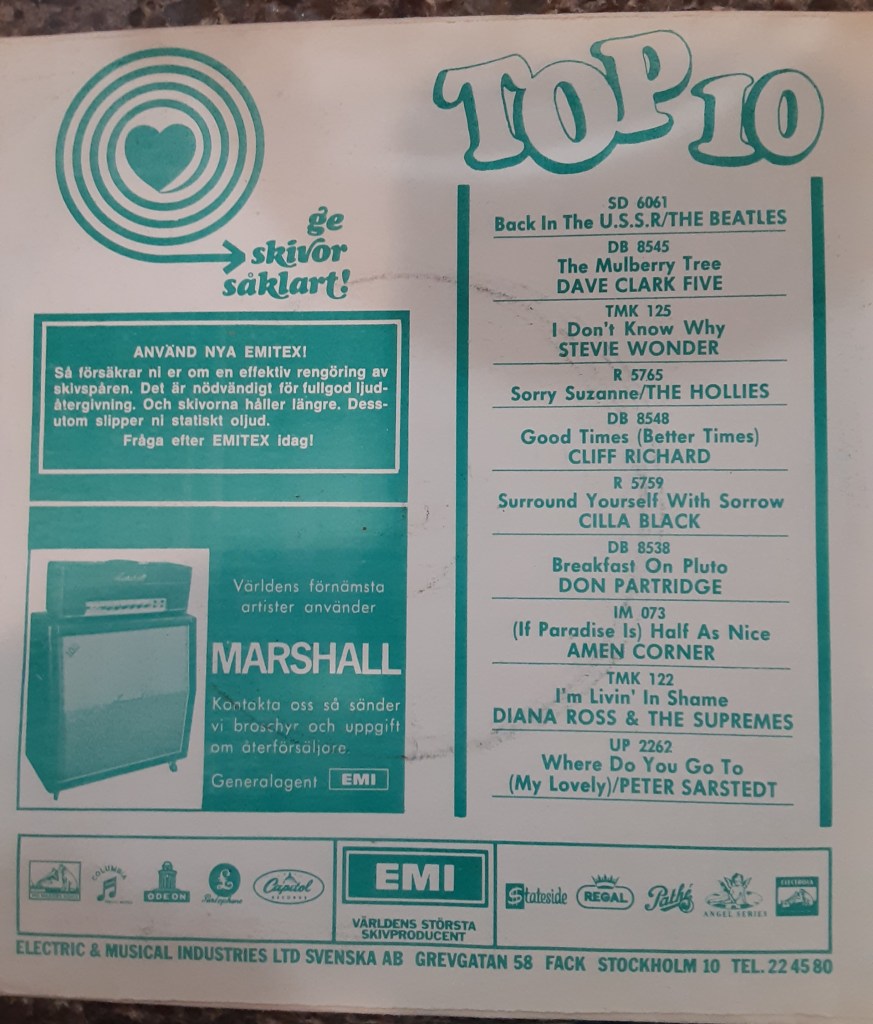 I can’t recall where I picked this up, but it is a Swedish release on Liberty. The back of the sleeve lists a Top 10, which I am guessing is a top 10 for records released by EMI, which apparently distributed many labels, in Sweden, at least. While most of the artists are household names (to one of my age/peer group), many of the songs listed are unknown to me: