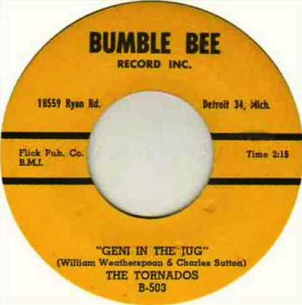 - “In 1959, the Tornados did some recording for Robert West, who owned a host of small Detroit labels (like Lu-Pine and Flick, on which he recorded the Falcons). This one was called Bumble Bee, and it had Charles’ old Royals/Midnighters buddy, Sonny Woods as a&r man. They cut at least two sides for West: “Love In Your Life” was a ballad with a beat, owing something to Clyde McPhatter and the Drifters, and a bit to the Impressions. It was penned by Charles and Robert Spencer, a baritone who was a utility fill-in for the Tornados whenever someone couldn’t appear. The flip was “Geni [sic] In The Jug,” in which the guy who rubs the lamp asks for a van so that he can bring Rock & Roll all over. It names various artists, and says “and don’t forget, we’ll be there too.”