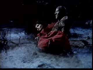 There is also a lot of activity in a swamp, as the Mummy has taken refuge there, bringing to mind The Creature from the Black Lagoon. Here’s the Creature (left) and the Mummy (right) in said aqueous milieus, bearing their chosen ones.