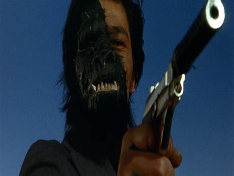 The two brothers take the King Caesar statue back to the temple, where they are accosted by a man who attempts to steal the statue from them. During the fight, the skin on half of the villain’s face melts away, revealing an ape-like visage, before he is killed by an unseen gunman: